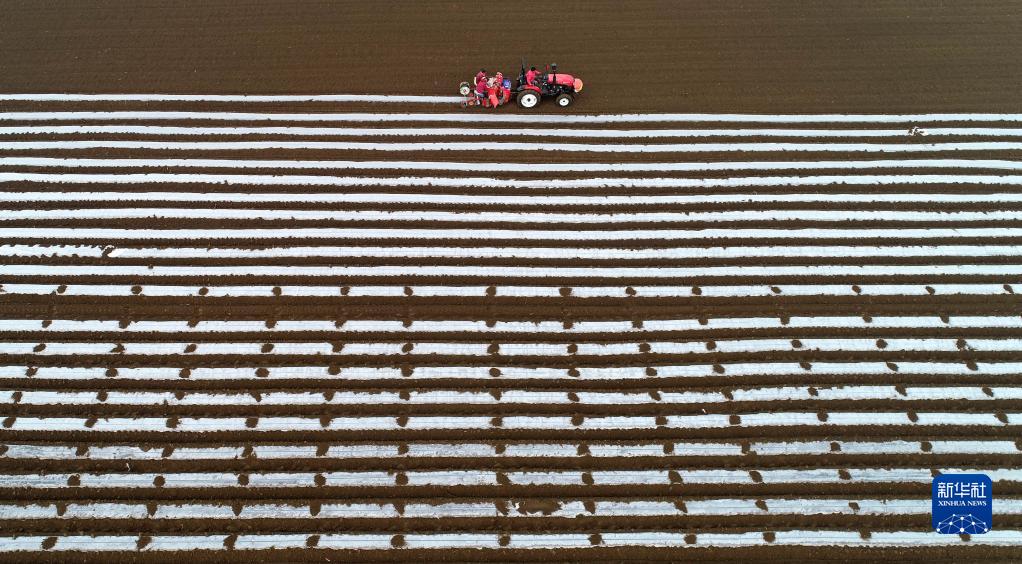 2月28日,在河北省石家莊新樂(lè )市東王鎮孔村馬鈴薯種植基地,農戶(hù)駕駛農機進(jìn)行馬鈴薯播種作業(yè)(無(wú)人機照片)。