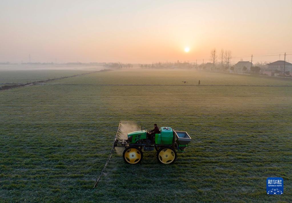 2月28日,在江蘇省泰州市姜堰區顧高鎮塘橋村松青家庭農場(chǎng)小麥田間,農戶(hù)駕駛植保機進(jìn)行噴藥作業(yè)(無(wú)人機照片)。