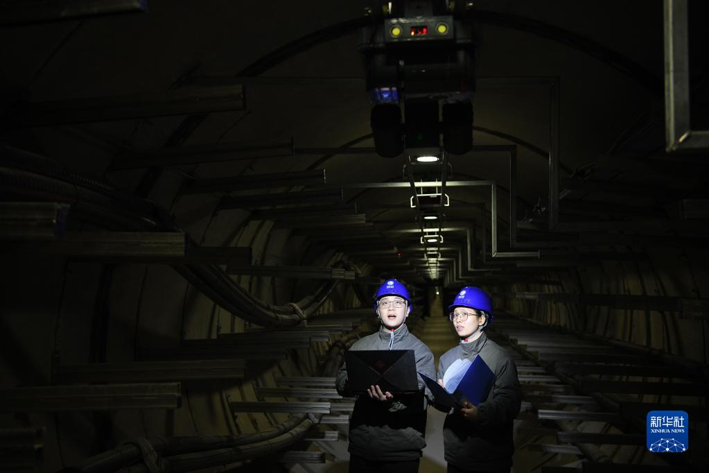 2月27日,國網(wǎng)合肥供電公司電纜運檢中心工作人員在巢湖湖底電纜隧道內調試“機器人巡檢員”。
