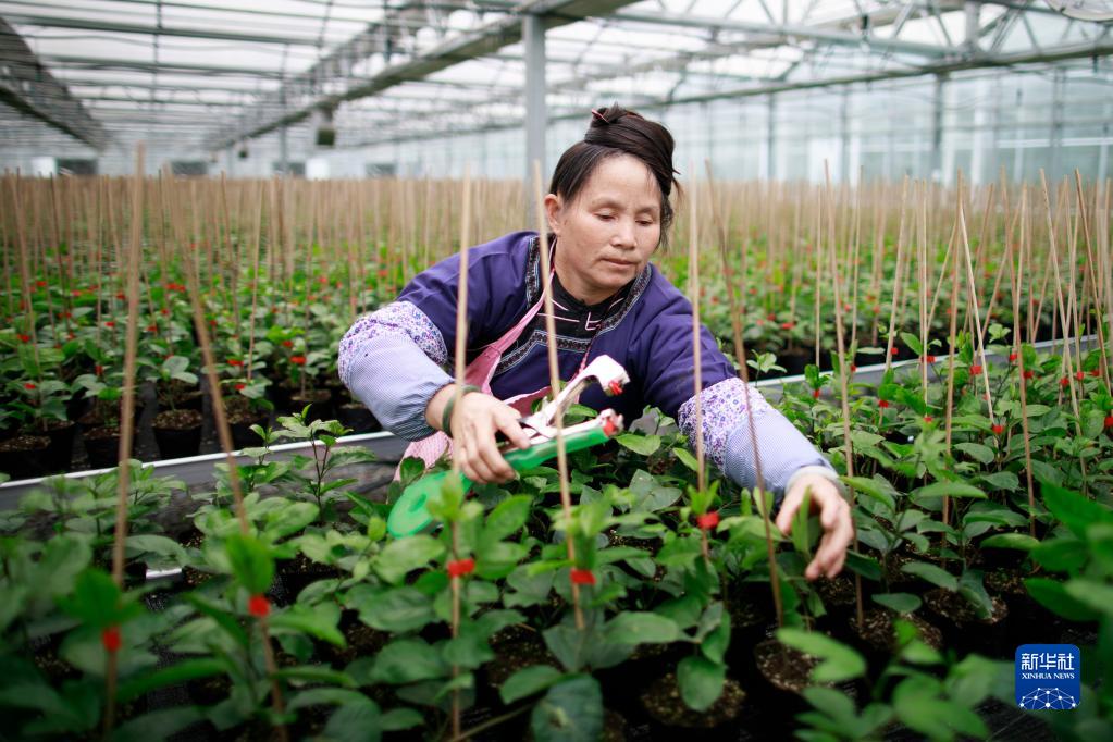 2月28日,一名少數民族婦女在大棚內對百香果苗進(jìn)行管理。
