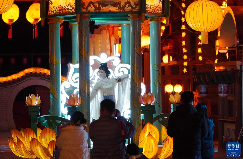 2月27日晚,在位于山東省東平縣的大宋不夜城,景區工作人員在表演。