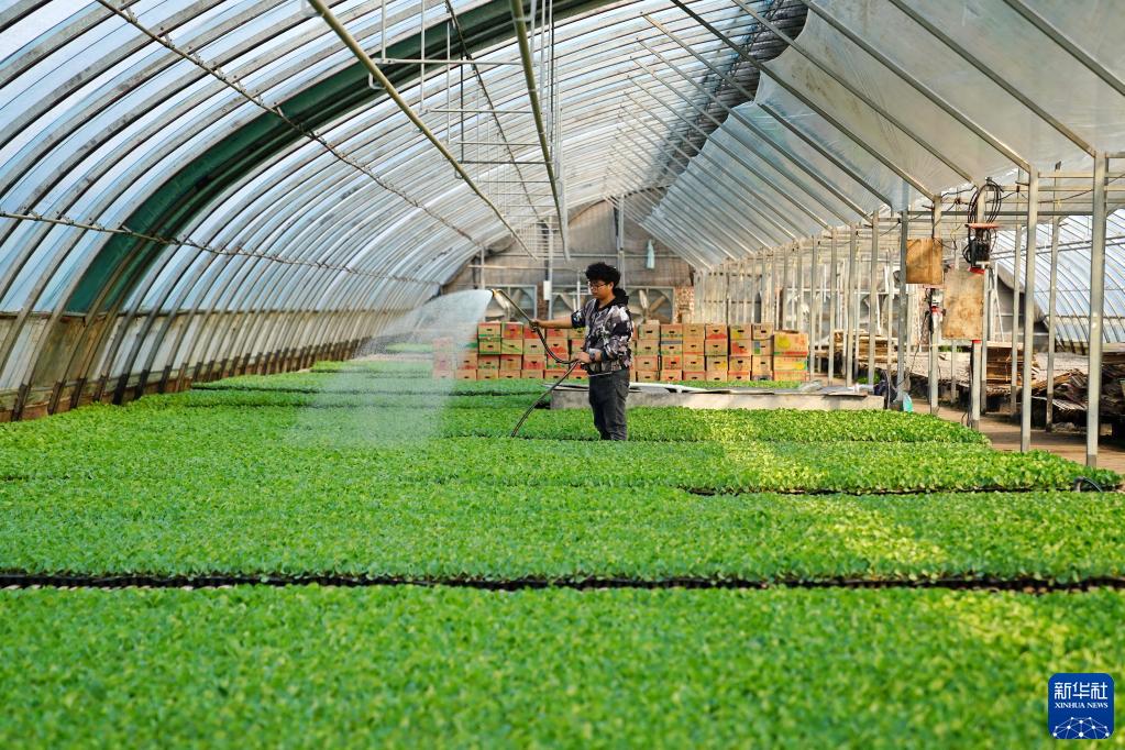 2月28日,河北省巨鹿縣觀(guān)寨鎮南哈口村村民在育苗棚內給蔬菜秧苗澆水。
