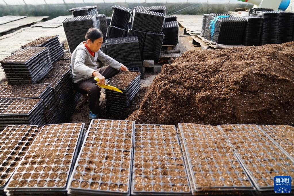 2月28日,在河北省巨鹿縣觀(guān)寨鎮一座育苗棚內,農民在給育苗盤(pán)裝培養土。