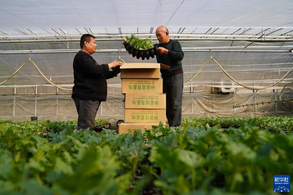 2月28日,在河北省巨鹿縣觀(guān)寨鎮一座育苗棚內,農民在將蔬菜秧苗裝箱。