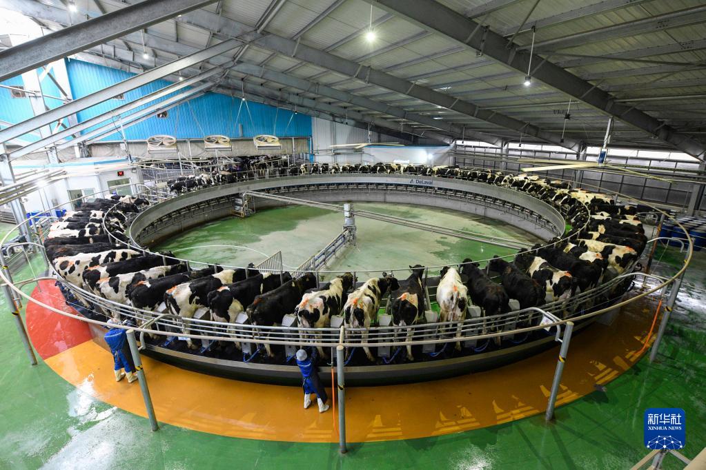 這是2月28日在豐寧縣魚(yú)兒山鎮一家智能牧場(chǎng)拍攝的轉盤(pán)式擠奶廳。