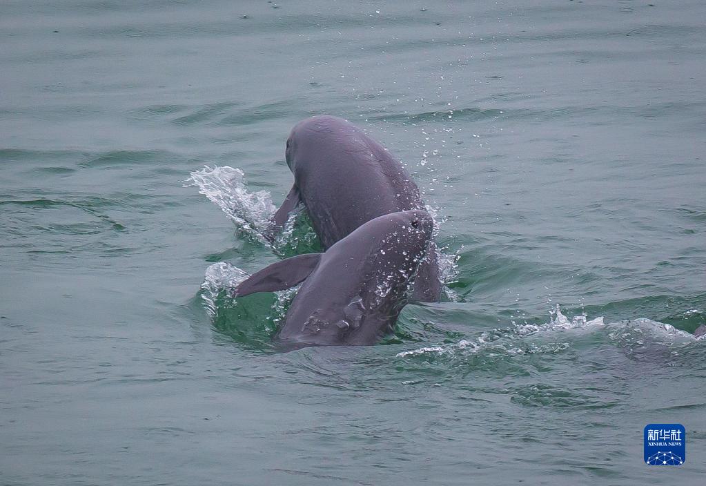 在湖北省宜昌市江邊,長(cháng)江江豚在水中嬉戲(2021年5月10日攝)。