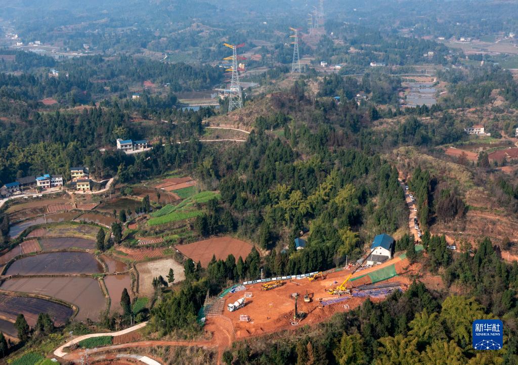 這是2月26日在重慶市潼南區小渡鎮拍攝的川渝1000千伏特高壓交流工程(重慶段)施工現場(chǎng)(無(wú)人機照片)。