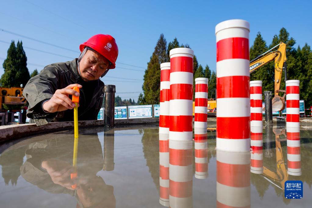 2月26日,在重慶市潼南區小渡鎮川渝1000千伏特高壓交流工程(重慶段)施工現場(chǎng),工程技術(shù)人員在檢查電力鐵塔基座是否符合技術(shù)標準。