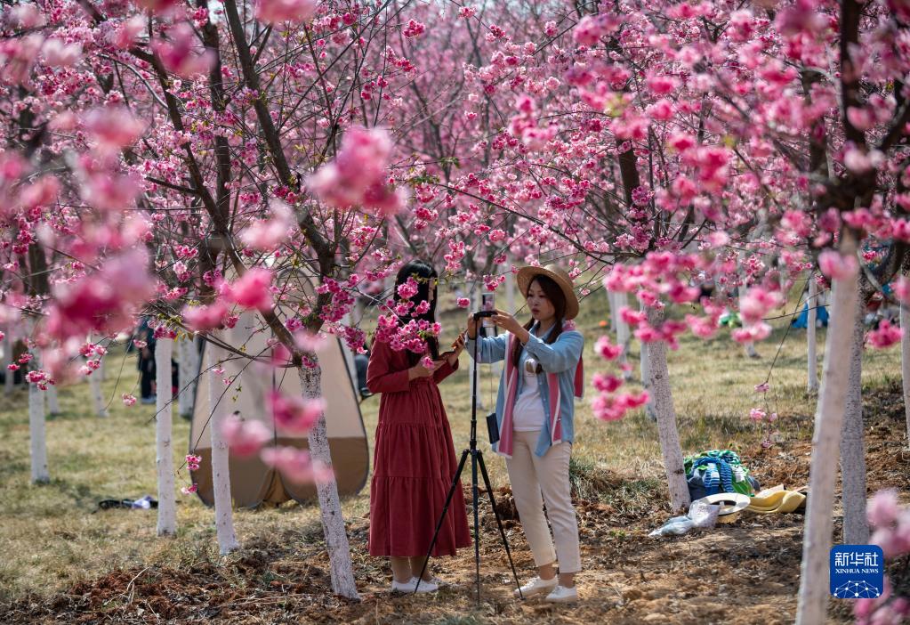 3月1日,兩名游客在宜良縣山后櫻花谷觀(guān)光直播。