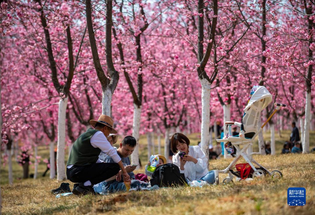 3月1日,游客在宜良縣山后櫻花谷櫻花樹(shù)下休閑。