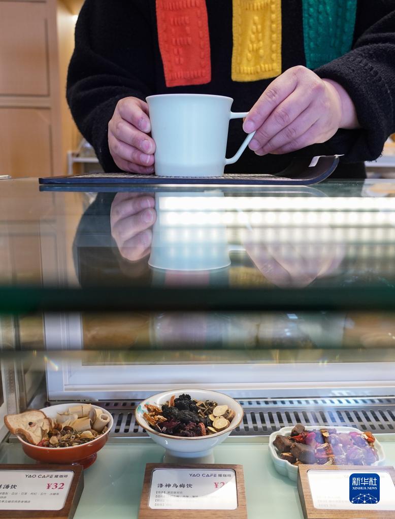 在位于北京西城區的老字號白塔寺藥店內的“耀咖啡”,柜臺中展示著(zhù)制作特色飲品的中藥材(2月22日攝)。