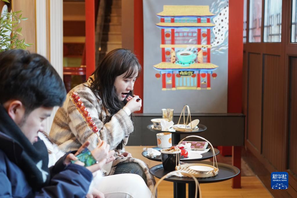 在位于北京大柵欄的內聯(lián)升“大內·宮?!笨Х葟d,顧客在品嘗特色茶點(diǎn)(2月18日攝)。