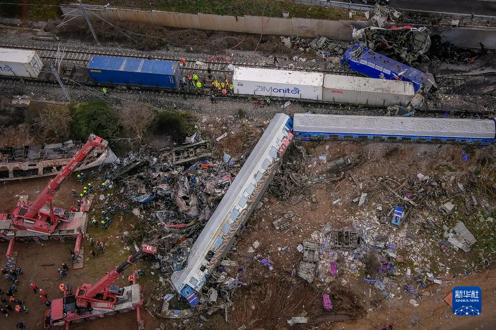 這是3月1日在希臘中部城市拉里薩市附近拍攝的火車(chē)相撞事故現場(chǎng)(無(wú)人機照片)。