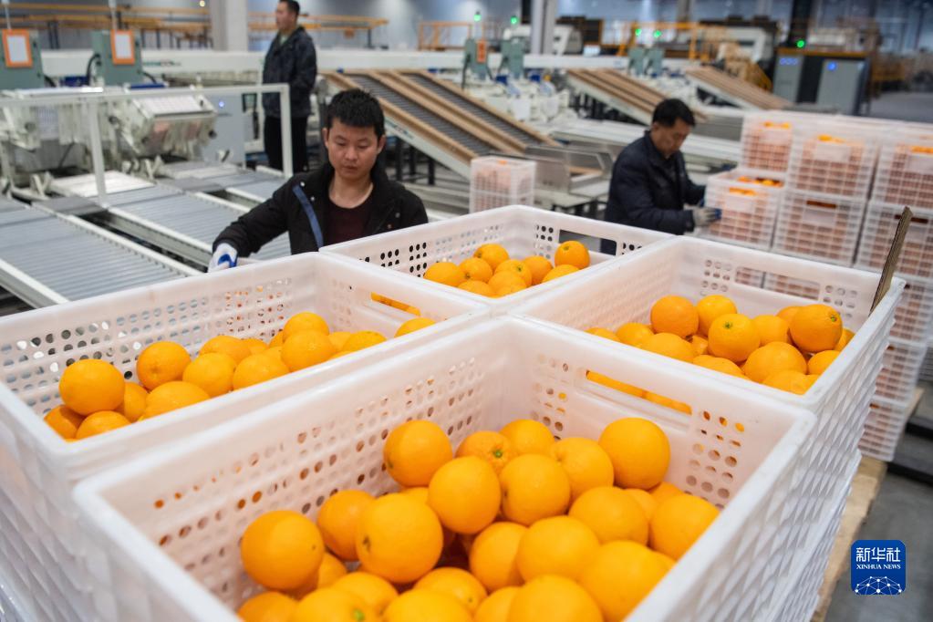 2月28日,在位于重慶市奉節縣的中國三峽柑橘(奉節臍橙)交易中心,工作人員在生產(chǎn)線(xiàn)上分選臍橙。該中心日處理果品最大產(chǎn)能達800噸,是西南片區最大的臍橙交易中心。