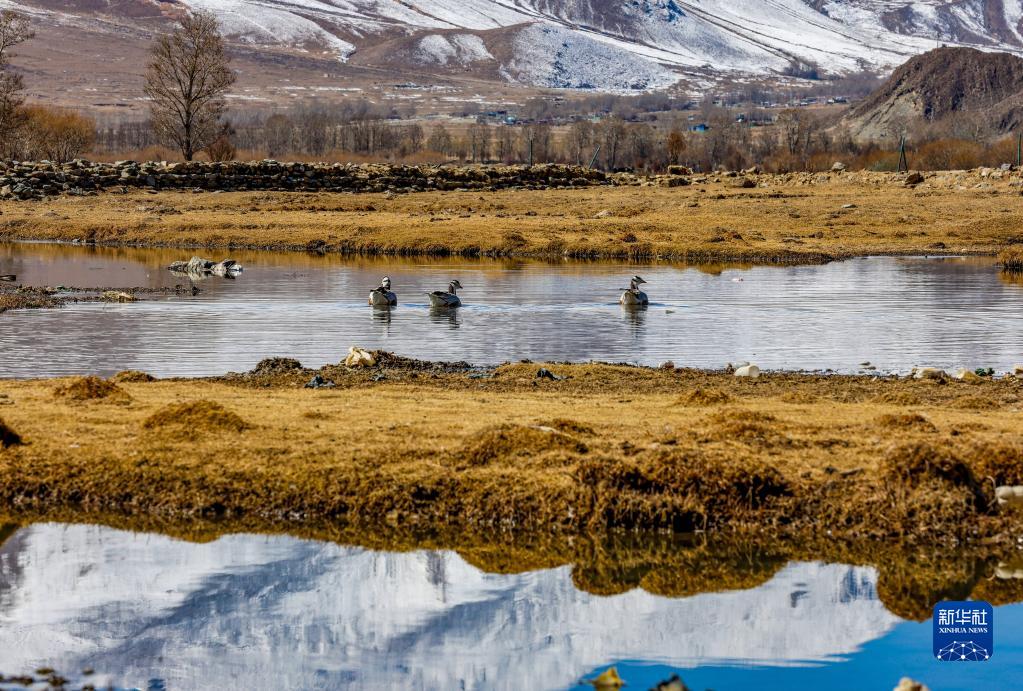 在拉薩市林周縣的濕地里休憩的斑頭雁(3月1日攝)。