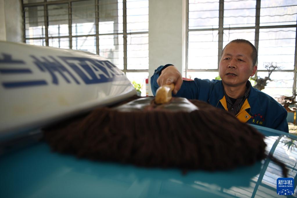 強漢紅在出車(chē)前擦拭車(chē)輛(3月1日攝)。