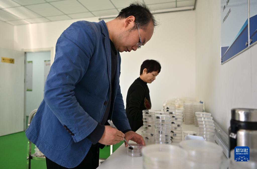 工作人員在中農熊蜂繁育基地蜂王交配室內工作(3月1日攝)。
