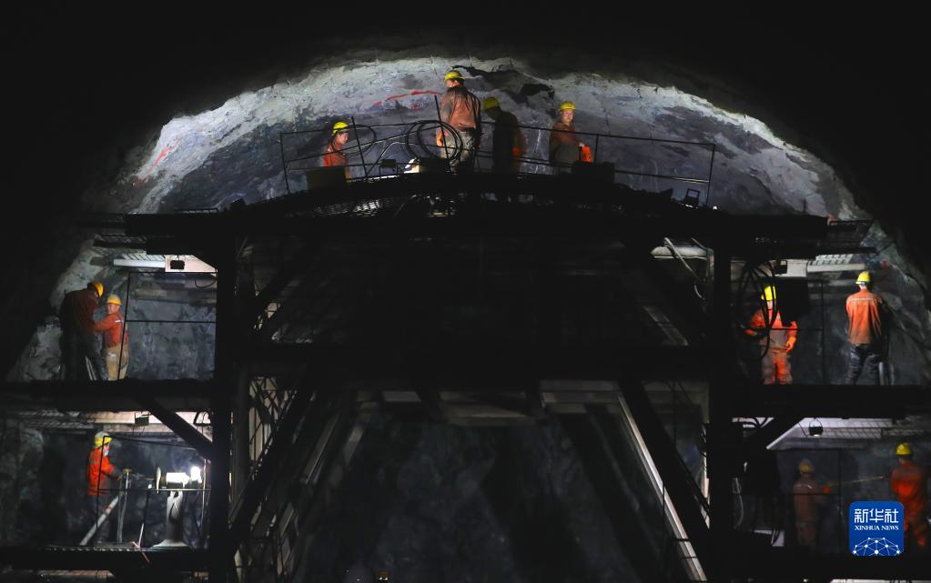 3月1日,在沈白高鐵遼寧段新賓隧道內,中鐵十九局施工人員在隧道內施工。