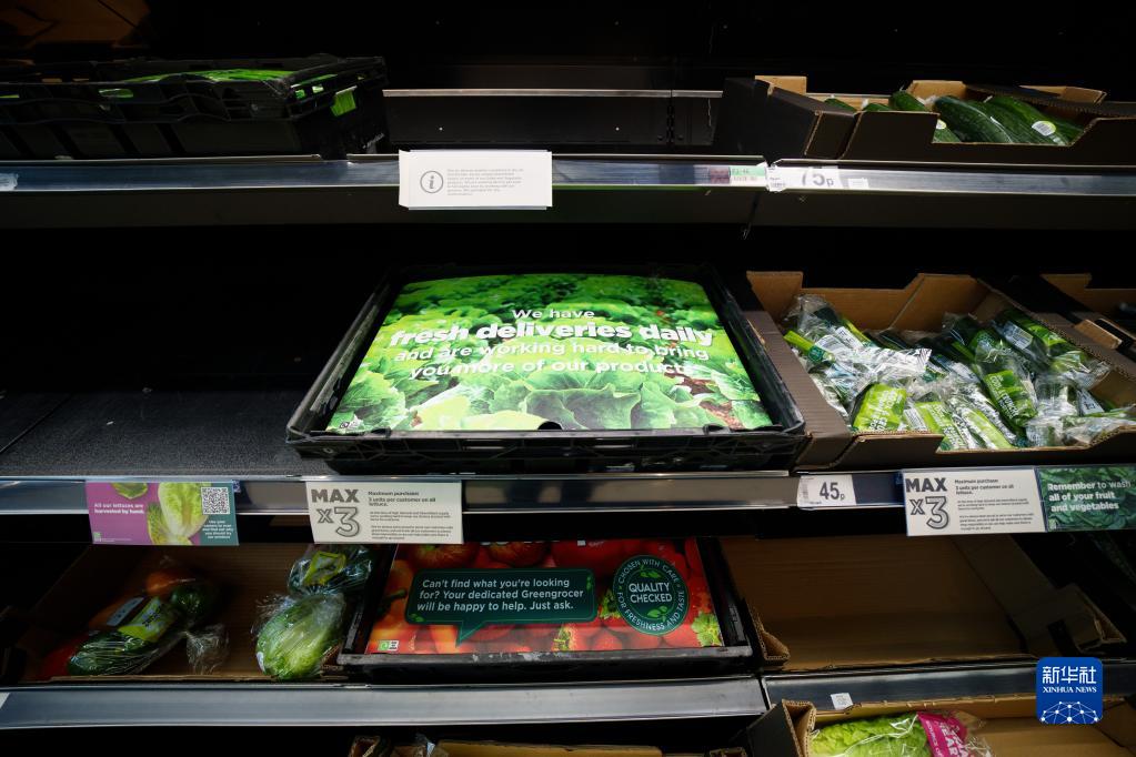 3月2日,在英國曼徹斯特,一家超市的蔬菜貨架出現缺貨。