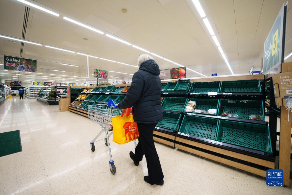 3月2日,在英國曼徹斯特,一家超市的蔬菜貨架出現缺貨。