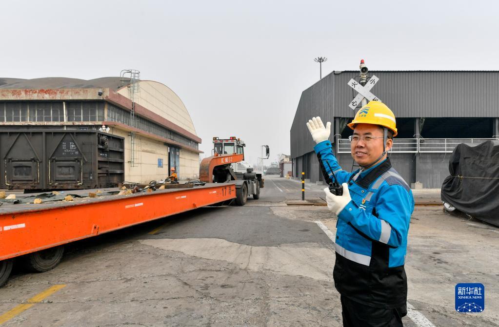 在天津港第一港埠有限公司散貨堆場(chǎng),成衛東指揮拖車(chē)(2月17日攝)。
