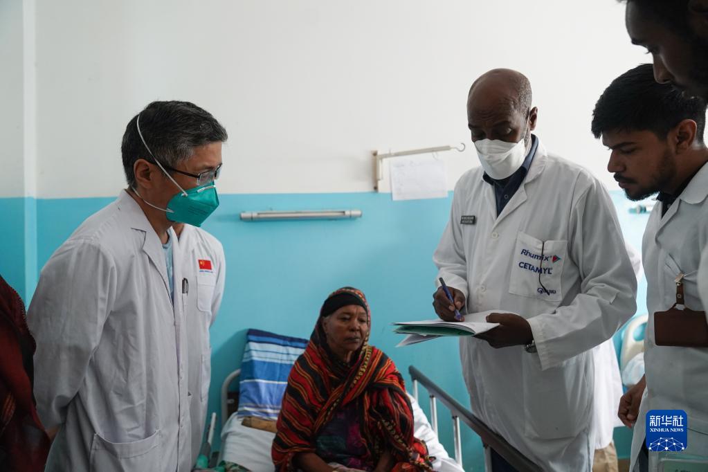 3月1日,在吉布提首都吉布提市貝爾蒂耶醫院,中國第21批援吉布提醫療隊醫生與當地醫生一起查房。