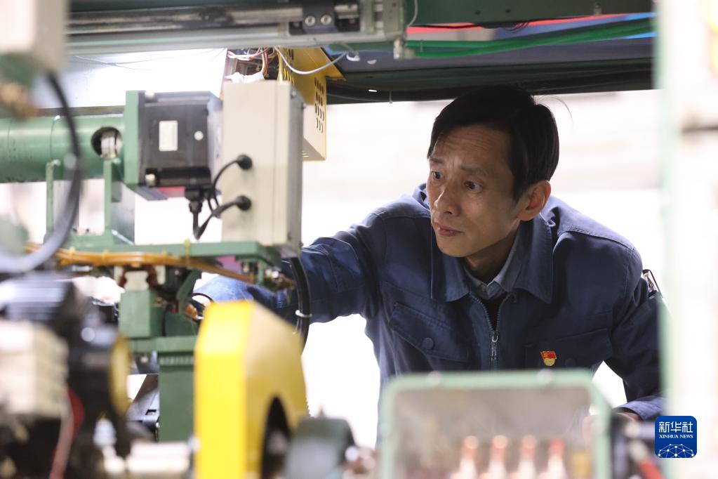 2月17日,全國人大代表、山東省泰安市泰山玻璃纖維有限公司設備動(dòng)力部部長(cháng)溫廣勇在進(jìn)行拉絲機設備升級的功能驗證。