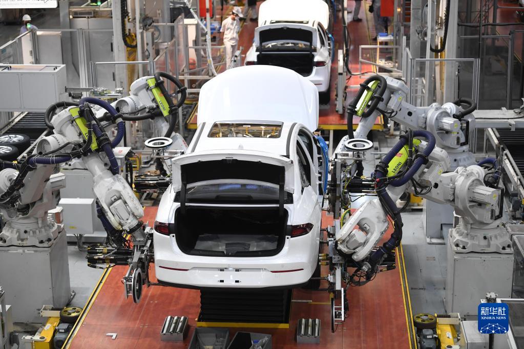 在廣州市番禺區的廣汽埃安新能源汽車(chē)股份有限公司總裝生產(chǎn)線(xiàn),機器人手臂在安裝汽車(chē)輪胎(2月24日攝)。