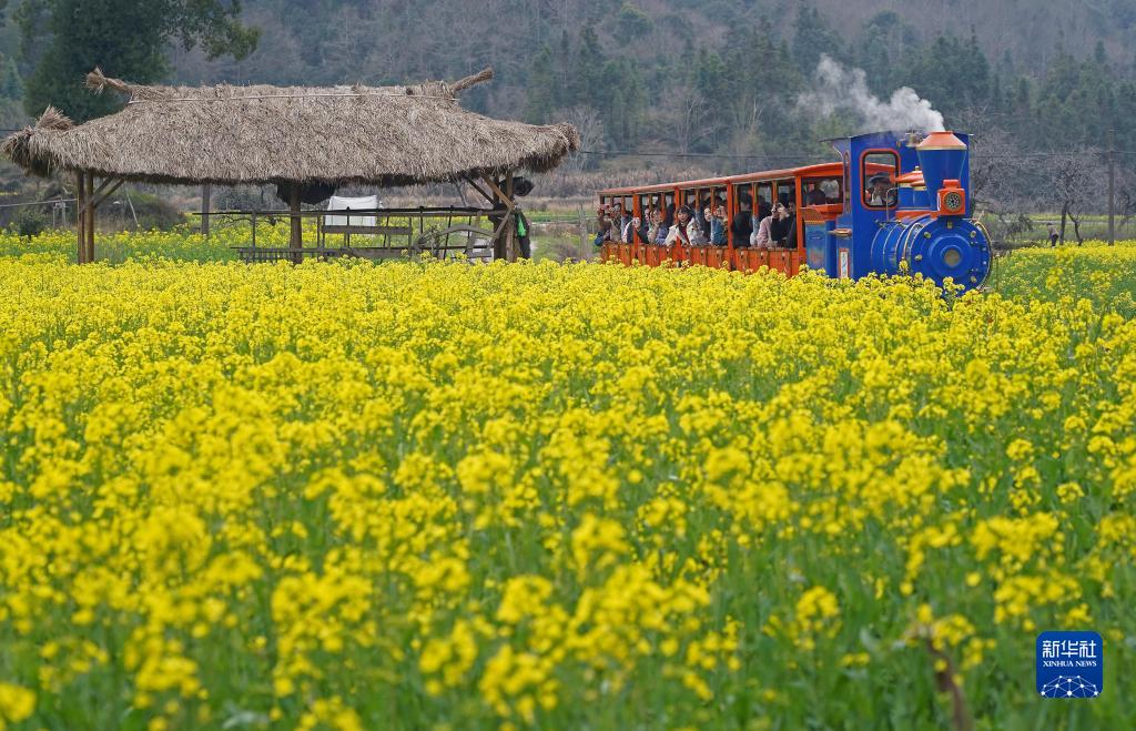 游客在江西省婺源縣嚴田景區乘坐“小火車(chē)”觀(guān)賞花海(3月3日攝)。