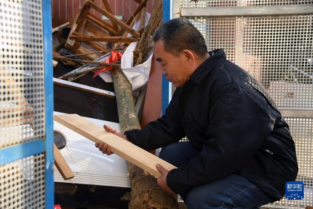 3月4日,在北京市順義區旺泉街道宏城花園社區大件垃圾回收站,殷萬(wàn)江挑選適合制作扶手的材料。
