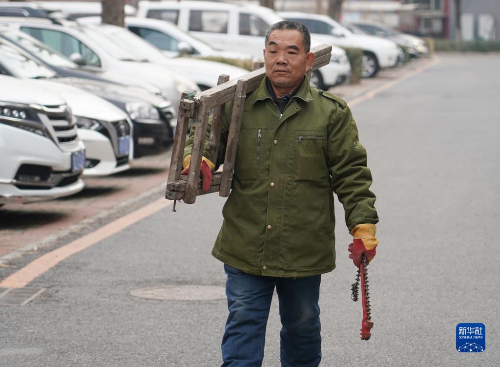 殷萬(wàn)江行走在北京市順義區旺泉街道宏城花園社區,準備對社區居民樓內的管道進(jìn)行維護(2月23日攝)。