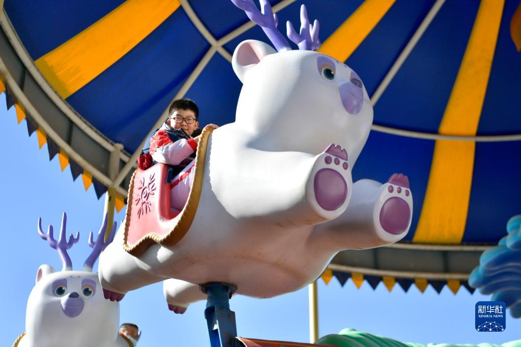 3月3日,在嘉峪關(guān)方特絲路神畫(huà)景區,小游客乘坐游樂(lè )設施。
