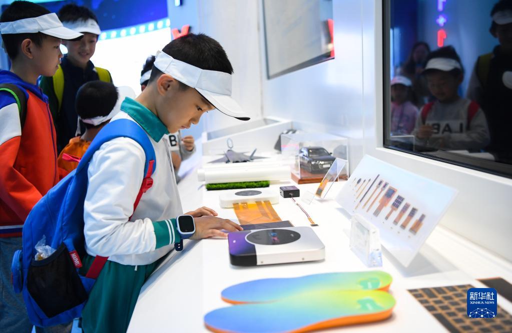 3月4日,在廣州黃埔區的航空輪胎大科學(xué)中心展覽館,參加研學(xué)活動(dòng)的小朋友觀(guān)看新材料產(chǎn)品。