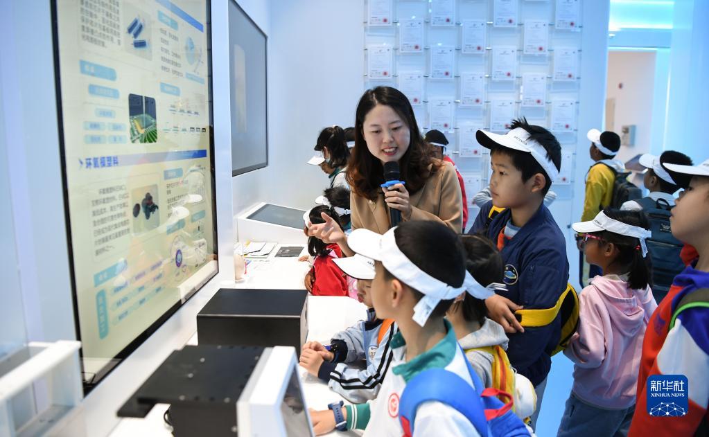 3月4日,在廣州黃埔區的航空輪胎大科學(xué)中心展覽館,工作人員給參加研學(xué)活動(dòng)的小朋友講解新材料知識。