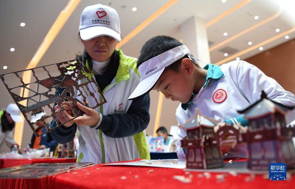 3月4日,在廣州黃埔區的航空輪胎大科學(xué)中心展覽館,參加研學(xué)活動(dòng)的小朋友在志愿者的幫助下制作建筑模型。