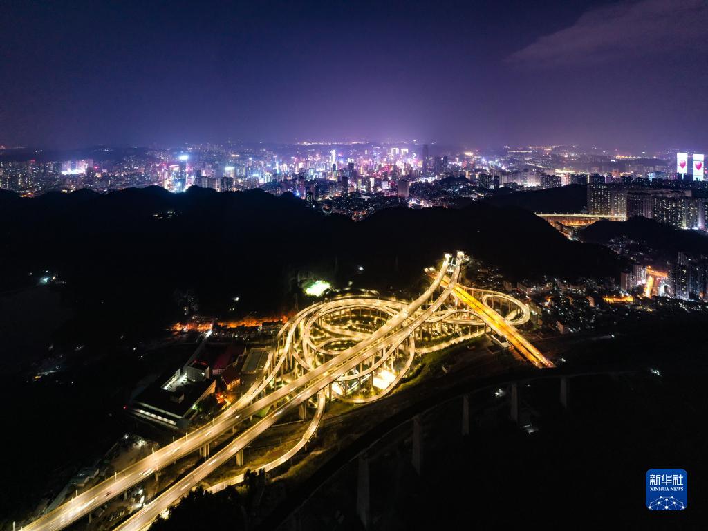 2月25日拍攝的貴陽(yáng)黔春立交橋夜景(無(wú)人機照片)。位于貴州省貴陽(yáng)市云巖區北京西路上的黔春立交橋,共有5層立體交叉、11條匝道、8個(gè)出入口,最大垂直落差為55米。