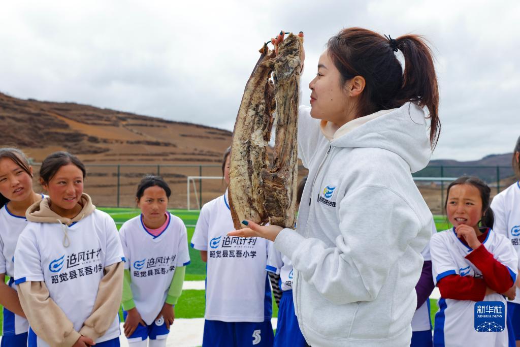 圖為四川籍的中國女足國腳萬(wàn)佳瑤(前)獲贈瓦吾小學(xué)女足球隊員從家里帶來(lái)的臘肉(2023年3月3日攝)。