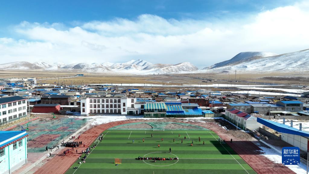 3月1日,在玉樹(shù)州曲麻萊縣,曲麻萊縣第一完全小學(xué)學(xué)生在足球課上(無(wú)人機照片)。