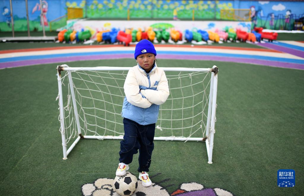 3月1日,在玉樹(shù)州治多縣,城南幼兒園小朋友羅松伊西在幼兒園的球場(chǎng)上。