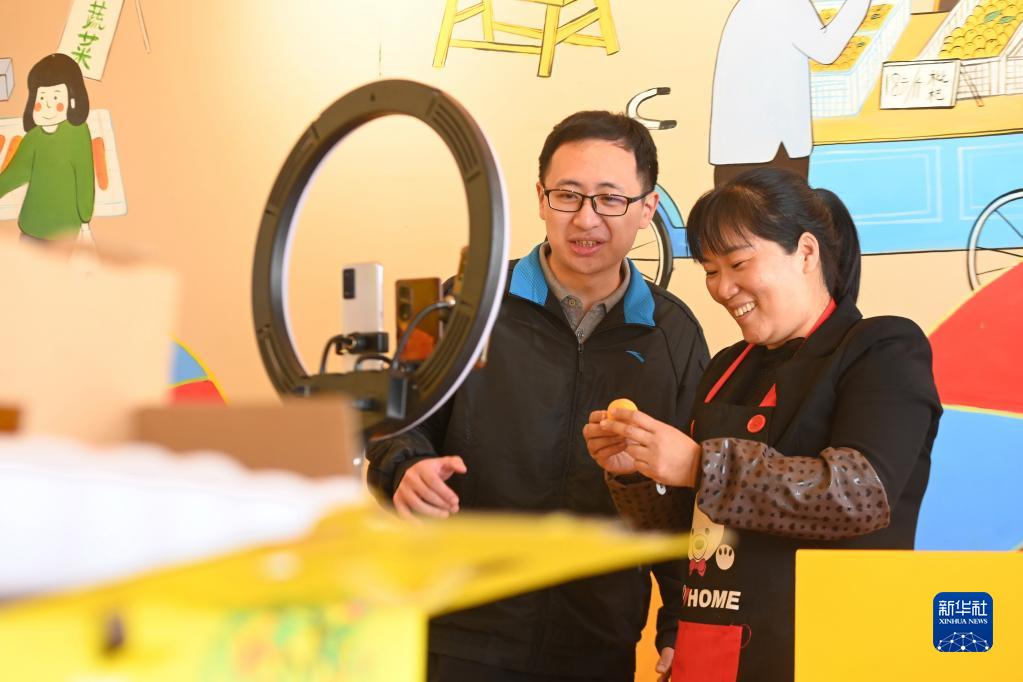 3月3日,吳素華(右)同棪樹(shù)村的駐村干部一起直播帶貨。