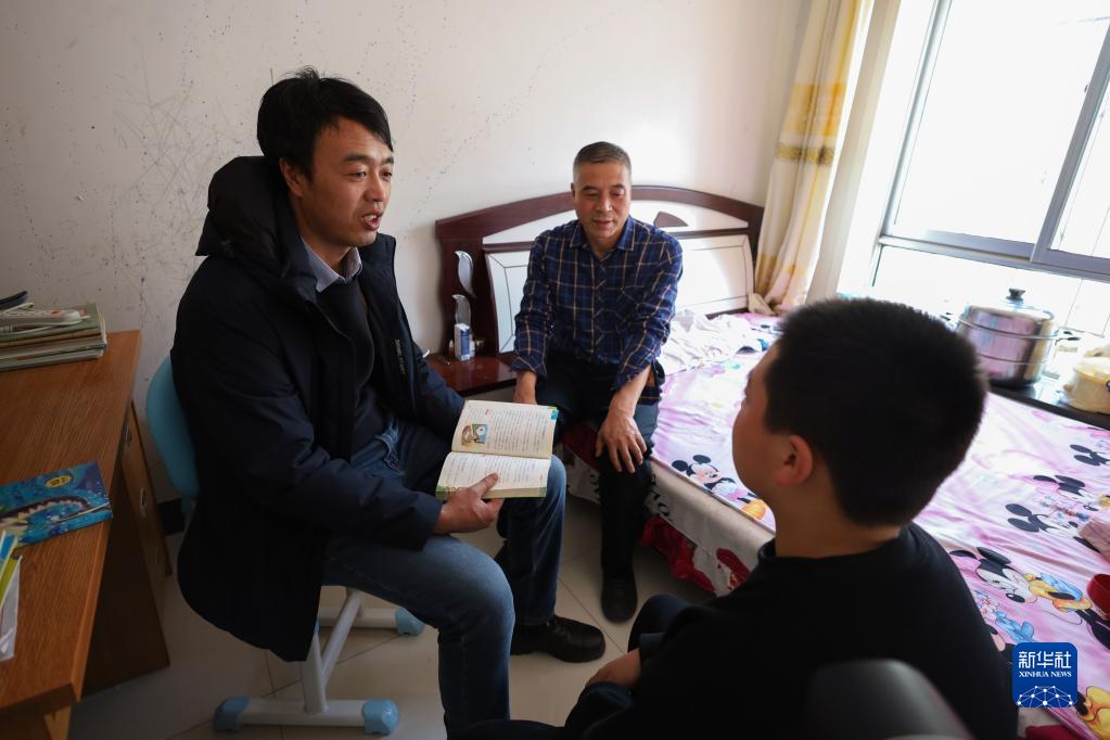 3月4日,劉富強(左一)在嘉峪關(guān)一小區內了解公益協(xié)會(huì )幫扶兒童學(xué)習情況。