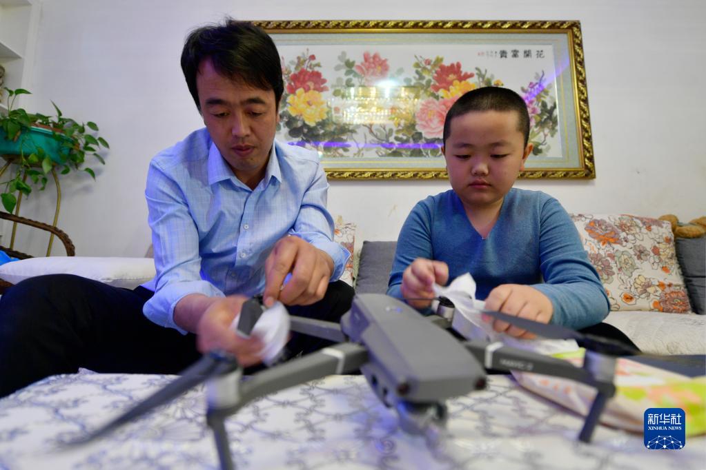 3月4日,劉富強(左)在家中和兒子一起保養救援裝備無(wú)人機。