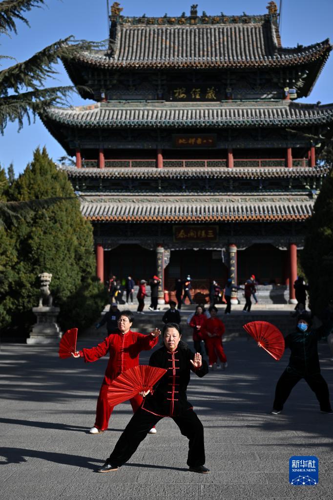 3月1日,在太原市迎澤區迎澤公園,市民練習太極扇。