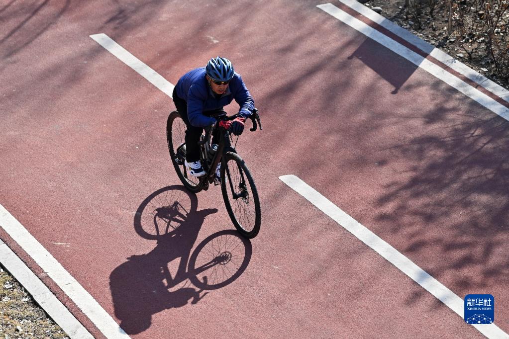 3月2日,市民在太原濱河自行車(chē)道騎行。