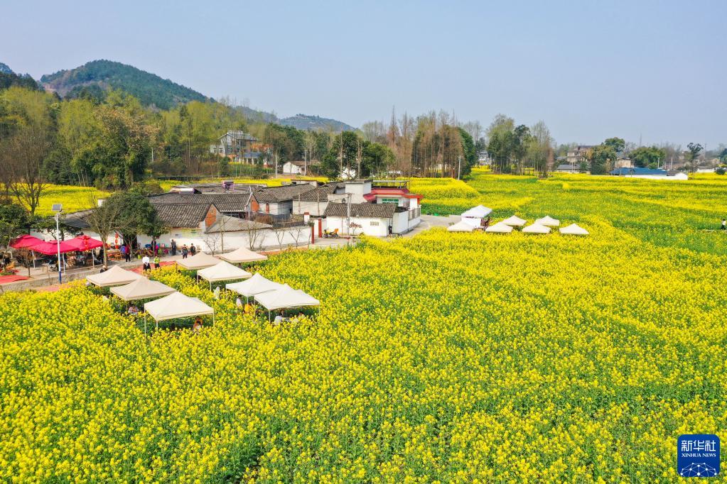 近日,位于四川成都崇州市的數萬(wàn)畝油菜花競相綻放,吸引游客前來(lái)踏春觀(guān)光。