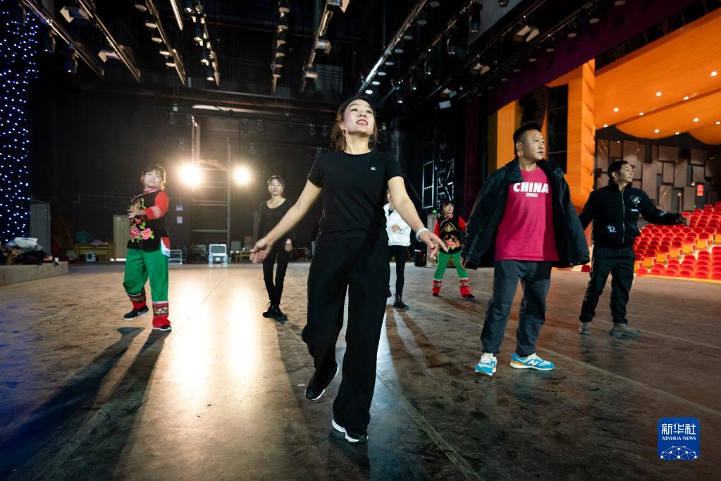 魯麗華(前)在南澗跳菜傳承展示中心與同事一起排練(2月7日攝)。