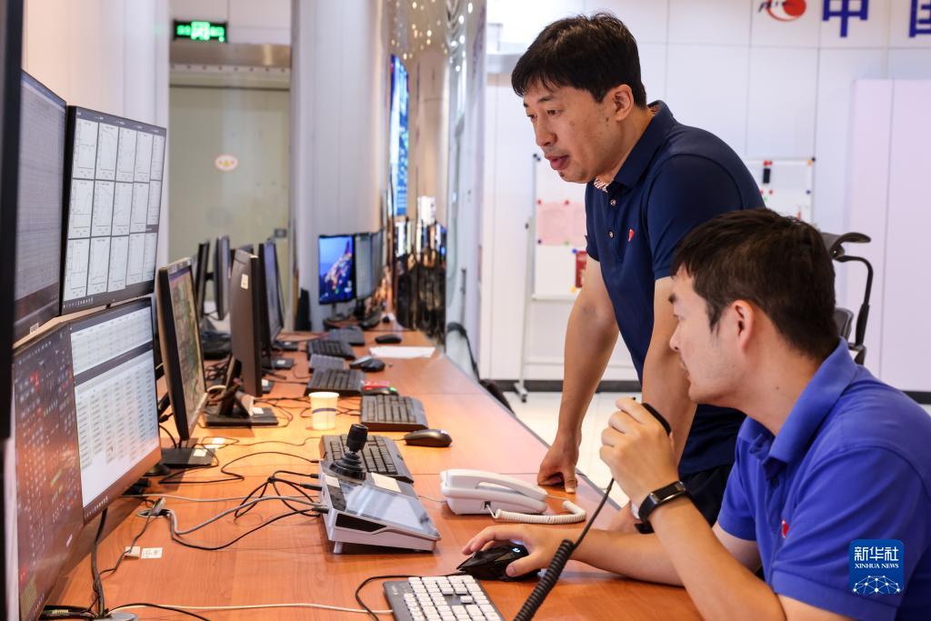 2022年8月25日,姜鵬(后)在“中國天眼”的總控室內與工作人員交談(維護保養期間拍攝)。