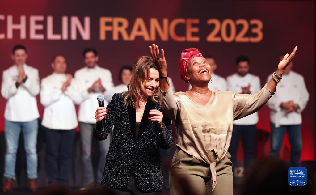 3月6日,在法國東部城市斯特拉斯堡舉辦的2023《米其林指南》法國版發(fā)布儀式上,獲頒米其林一星的原籍貝寧的法國廚師喬治亞娜·維烏(前右)慶祝。
