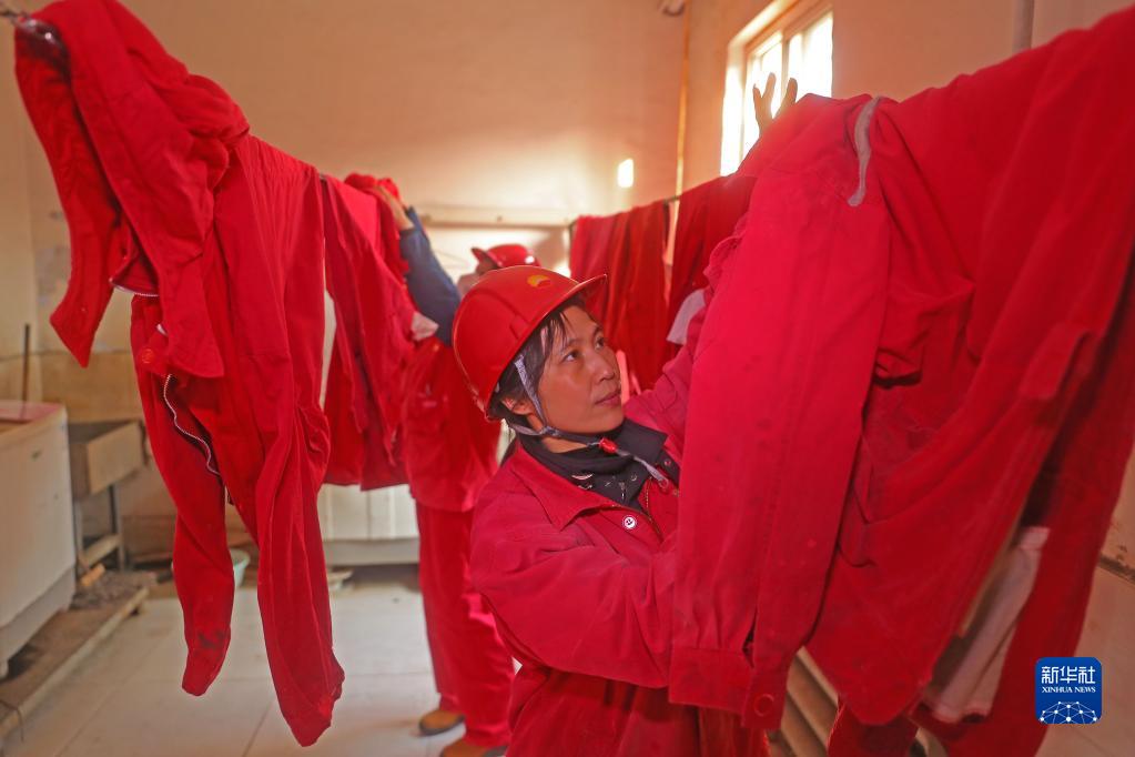 2月27日,在焊接車(chē)間洗衣房,王喜蓮在晾曬工服。