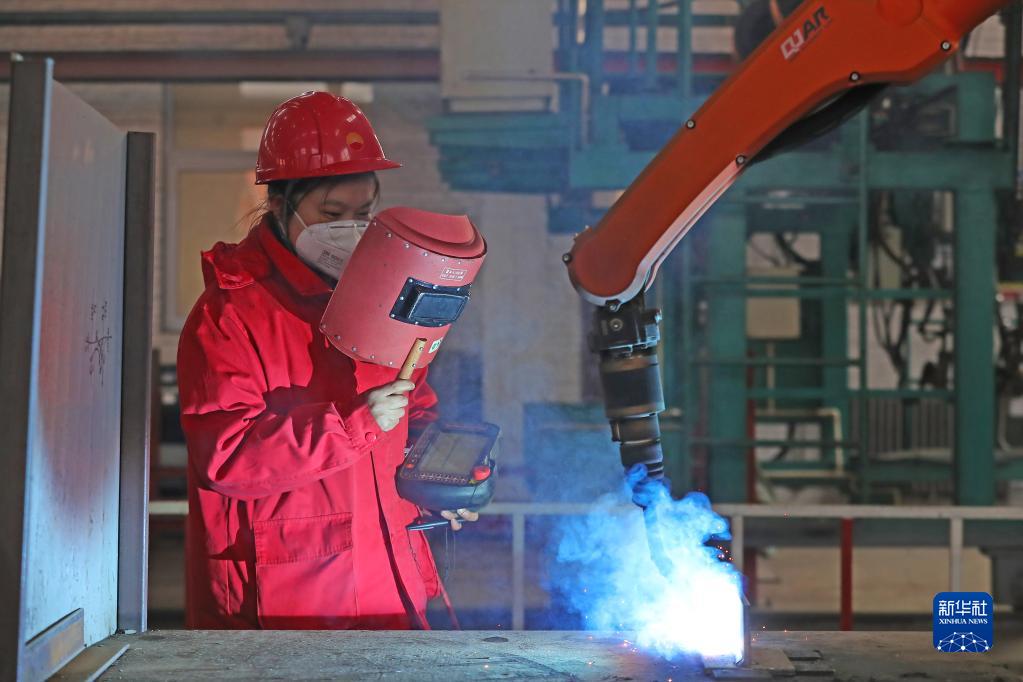 2月27日,楊景愛(ài)操作焊接機器人進(jìn)行作業(yè)。